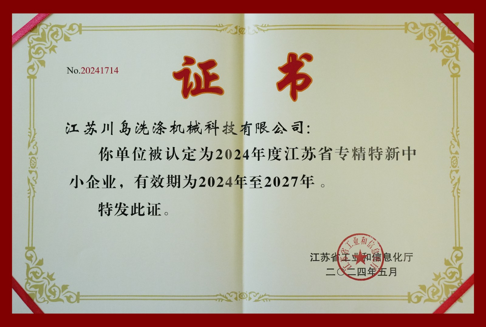 江蘇川島榮獲"2024年度江蘇省專精特新中小企業(yè)"榮譽(yù)稱號!
